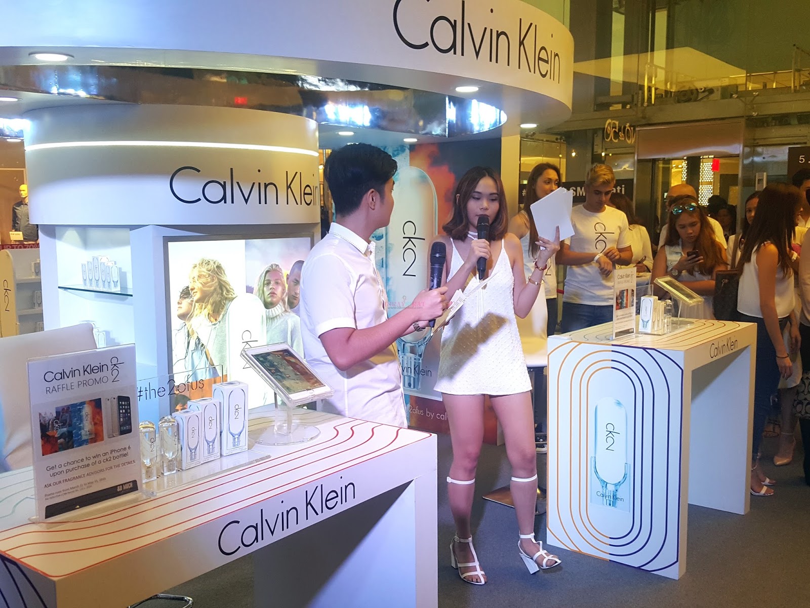 模特们四处走动,让与会者尝试ck2的双重香味。