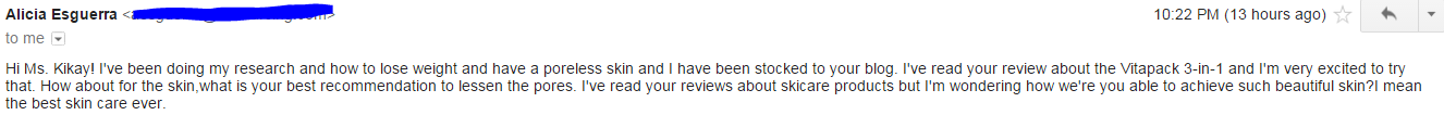嗨Kikay女士!我一直在做我的研究,如何减肥和拥有一个无缝隙的皮肤,我已经储备了你的博客。我读了你关于Vitapack 3-in-1的评论,我很高兴能尝试一下。皮肤呢,你的是什么最好的建议是减少毛孔。我读了你对滑雪板产品的评论,但我想知道你是如何获得这么漂亮的皮肤的?我是说最好的皮肤护理。