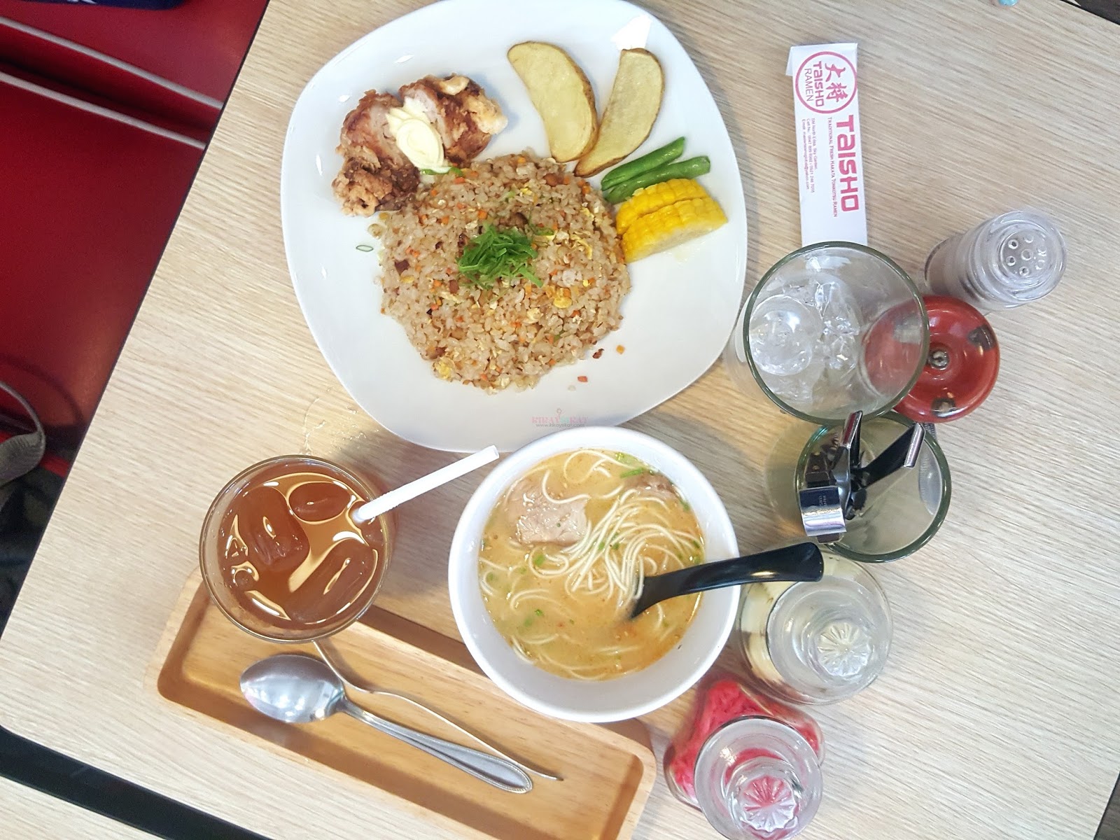 我忘记给菜单拍照了,因为我的思绪被马上的盛宴占据了。但他们通常的拉面价格在350-500美元之间。如果你考虑到他们的位置和环境,这是相当昂贵的。这家餐厅给人的感觉很随意。好在他们有售价199美元的套餐,其中包括鸡肉、炒饭、冰茶和半碗茶拉面。是的。我就是这么精打细算,呵呵。