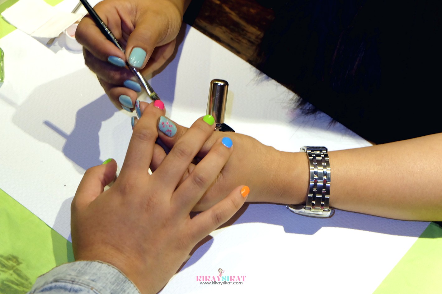 粉红,霓虹蓝,霓虹橙,霓虹绿。对了,那是Kumi的手